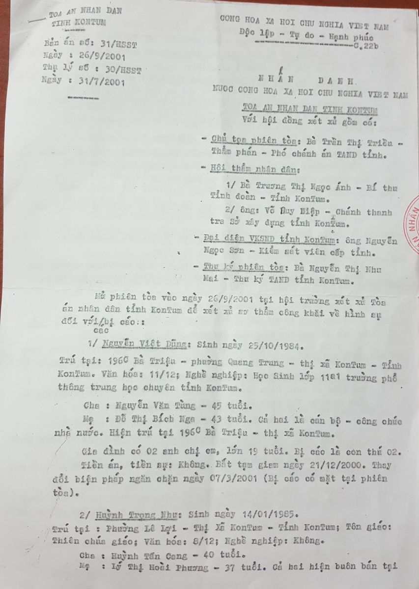 Ngày 31/7/2001, TAND tỉnh Kon Tum thụ lí vụ án số 30/HSST, đến ngày 26/9/2001 đưa ra xét xử, tuyên Bản án sơ thẩm số 31/HSST đối với Thái Quang Thanh, lại chỉ là “hành vi gây rối trật tự công cộng”, cho hưởng18 tháng tù treo. Một điều bất hợp lí, tại nhà Thái Quang Thanh và 7 người đã lên kế hoạch tổ chức, có mang theo hung khí nguy hiểm (rất nhiều dao). Tòa đưa ra căn cứ, việc Thanh, Thành... dùng dao, chai, gạch đuổi đánh Nhơn làm bị thương nhiều người, gây hoang mang, lo sợ cho quần chúng Nhân dân, xâm phạm đến trật tự an toàn công cộng. Đây là vụ án đồng phạm, có nhiều bị cáo tham gia thực hiện hành vi phạm tội. Các bị cáo đều trong thời gian đi học, nhưng gây hậu quả nghiêm trọng, vụ án có nhiều tình tiết phức tạp.