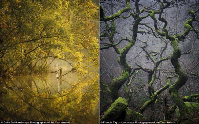 Hình ảnh ấn tượng này (trái) được chụp tại hồ Tử thần trong rừng Delamere, Cheshire. Những cây cổ thụ (phải) bị rêu bám đầy thân trong vườn quốc gia Peak District ở Derbyshire.