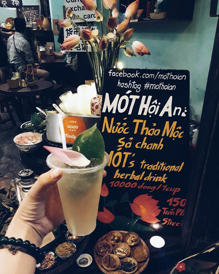 Đã đến Hội An thì đừng quên uống thử nước mót. Đây là món giải khát rất dễ chịu khi bạn đã đi dạo mỏi chân trong khu phố cổ. Sự kết hợp hoàn hảo giữa trà thảo mộc, sả chanh và cánh sen vô tình làm cho một món nước dân dã này mang hương vị vô cùng đặc biệt, dễ dàng xua tan cái nóng của trưa hè.