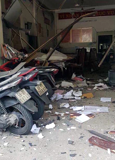 Công an TP HCM xác định, vụ nổ khiến nữ cảnh sát tiếp dân bị thương nhẹ. Tại hiện trường, một chiếc xe máy bị biến dạng, nhiều đồ vật và mảnh vỡ văng khắp nơi. Một số xe khác và khu vực phía trước trụ sở công an ám khói đen...