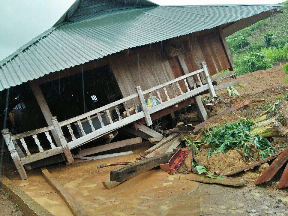 Căn nhà sàn của người dân bị lũ đất vùi lấp, đứng trước nguy cơ sụp đổ bất cứ lúc nào