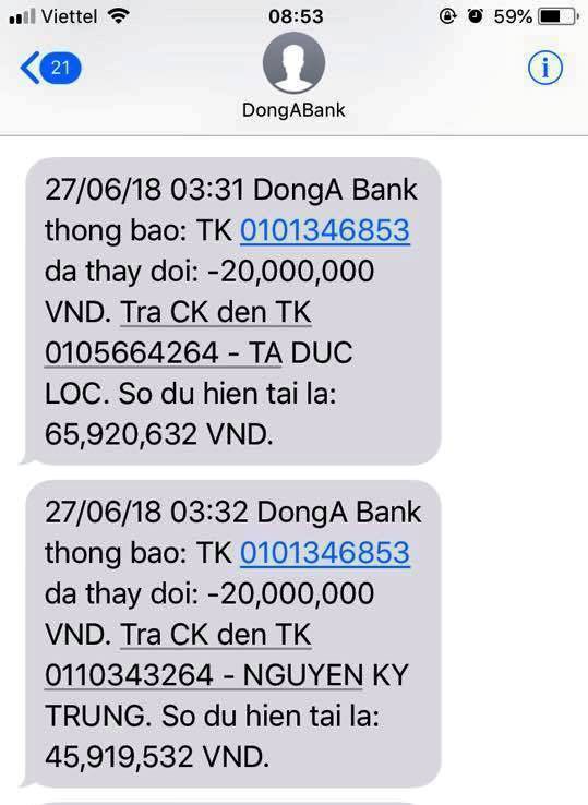 Cụ thể, từ 3h31 phút đến 3h33 phút cùng ngày, hệ thống từ DongA Bank đã gửi tin nhắn đến điện thoại của chị Thùy và thông báo tài khoản của chị đã chuyển 60 triệu đồng vào 3 tài khoản khác nhau. Mỗi lần chuyển khoản là 20 triệu đồng.