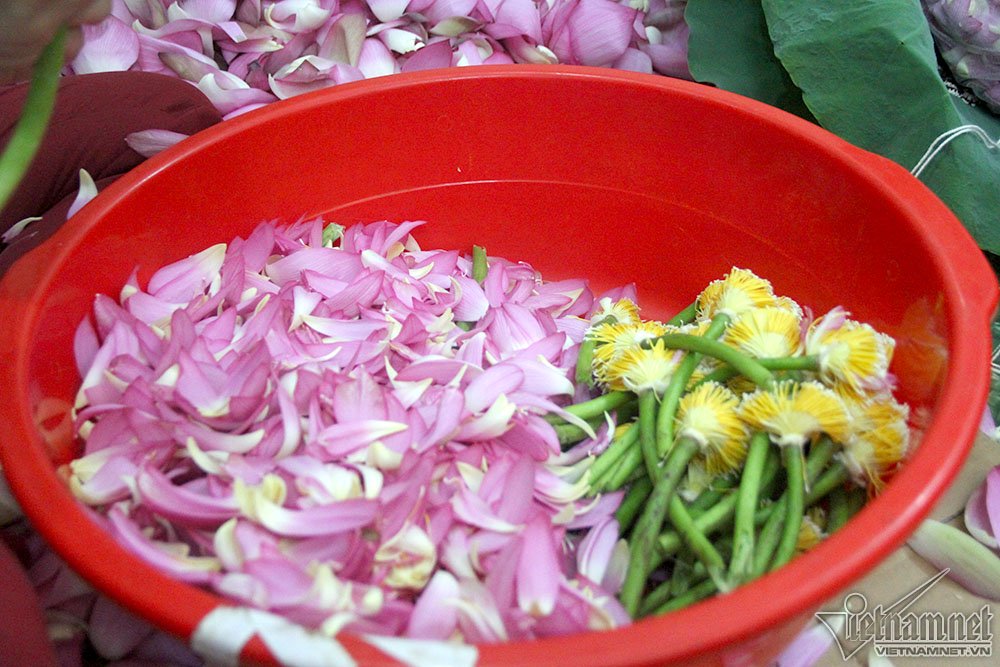 Hoa sen phải hái trước bình minh. Sen Hồ Tây có nhiều cánh xếp vào nhau, nhụy vàng thẫm, cánh hồng phớt sắc, màu hồng rất lạ, không nhạt không sẫm, hương thơm ngào ngạt