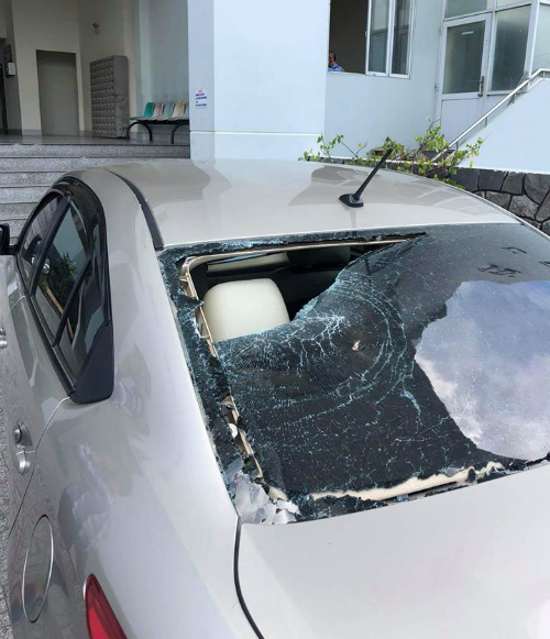 Kính ô tô bị người đàn ông chạy xe máy mặc áo Grab Bike đập vỡ. Ảnh Hiếu Đặng.