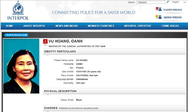 Thông tin truy nã về Vũ Hoàng Oanh đã được đăng tải công khai trên website của Tổ chức Cảnh sát hình sự Quốc tế (Interpol).