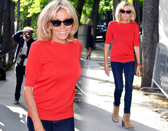 Bà Brigitte Macron gây chú ý khi mặc jeans bó sát dự Tuần lễ thời trang cao cấp Paris hồi tháng 7.