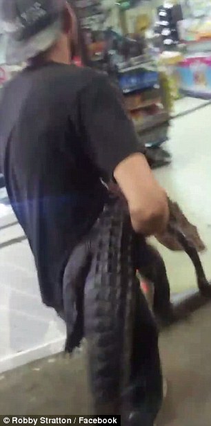 Nhiều người đang mua sắm trong siêu thị đã khá hoảng hốt chứng kiến cảnh tượng này. Người đàn ông bế một con cá sấu vào để mua đồ. Thậm chí, anh ta còn dùng con cá sấu để hù dọa những người trong đó.