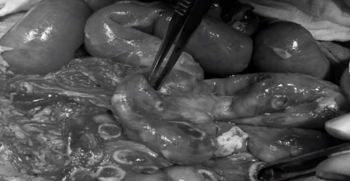 Hình ảnh đoạn ruột bị thủng 50 lỗ của cậu bé khi được phẫu thuật. Ngoài ra. bé còn bị nhiễm trùng, nhiễm độc.