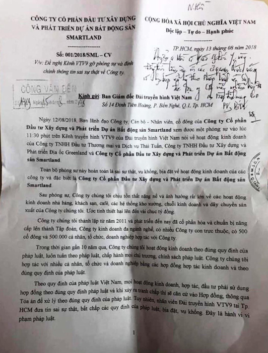Phía Công ty Smartland còn tuyên bố sẽ làm đơn khởi kiện VTV9 nếu thời gian từ 1-3 ngày không gỡ phóng sự đã đăng tải.
