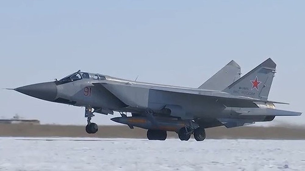 Tên lửa siêu thanh Kinzhal lắp dưới bụng máy bay đánh chặn MiG-31K. Ảnh: Bộ Quốc phòng Nga.