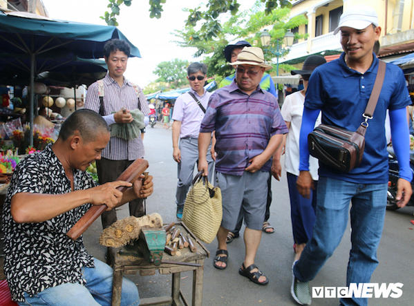 Các tiểu thương của ngôi chợ lớn nhất phố cổ đã quen tai với những thanh âm của dùi đục. Còn hình ảnh người đàn ông tỉ mẩn bên các gốc tre dường như đã in đậm trong tâm trí của bà con phố cổ cùng du khách thập phương. (Ảnh: Thanh Ba)