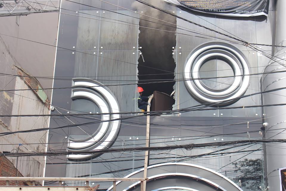 Lực lượng PCCC tỉnh Lâm Đồng phá cửa kính để vào bên trong khống chế ngọn lửa.