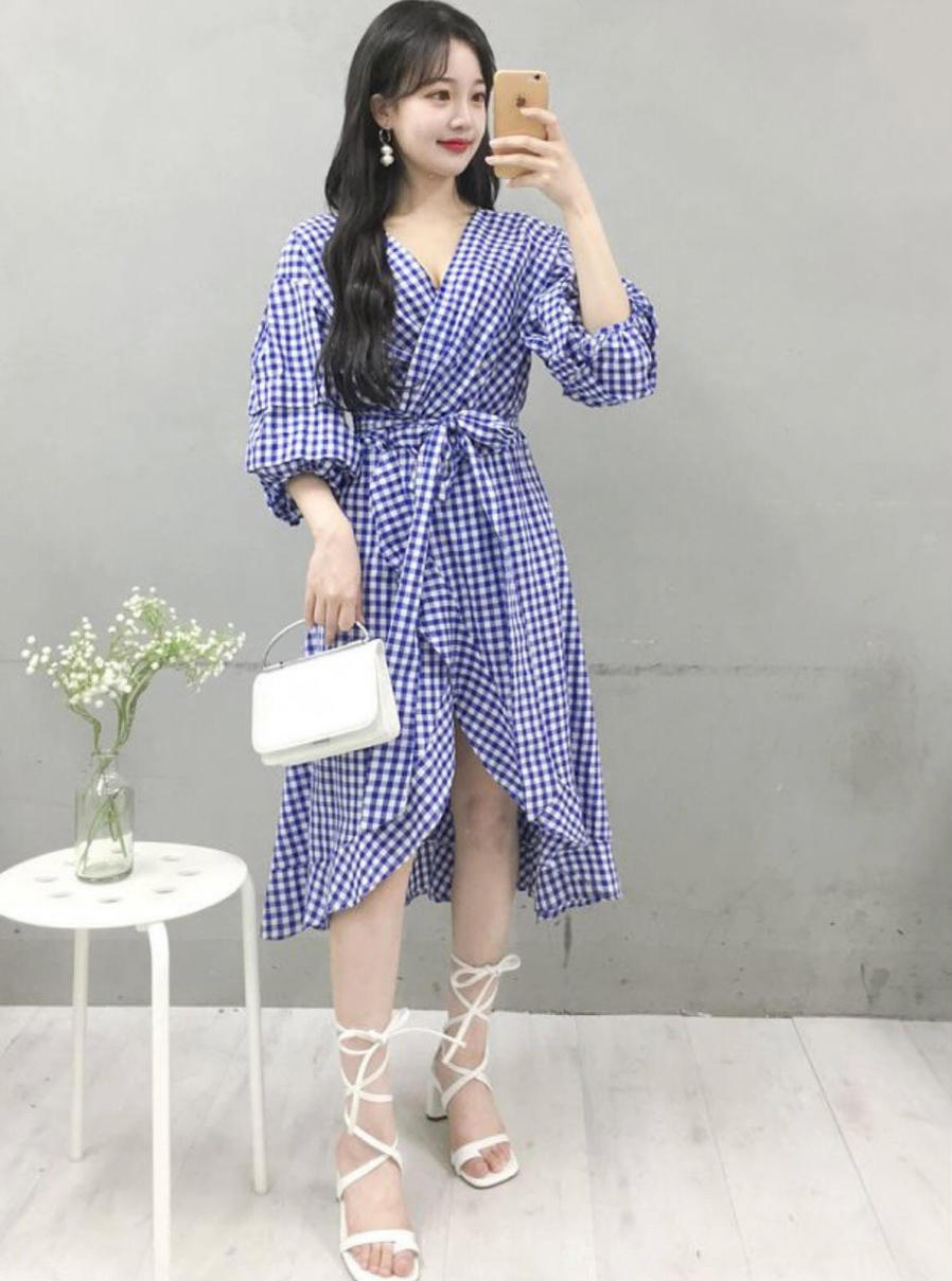 Xu hướng váy quấn (wrap dress) cổ V quyến rũ kết hợp cùng hoạ tiết caro khiến cho bạn gái thêm trẻ trung, năng động.
