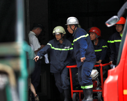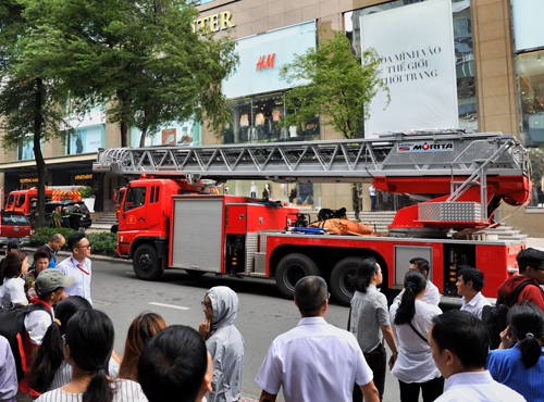 Cảnh sát PCCC TP HCM điều nhiều xe thang cùng hàng chục chiến sĩ đến hiện trường. Lính cứu hỏa mang nhiều máy móc vào trong, đập cửa kính của tòa nhà để giải phóng khói.