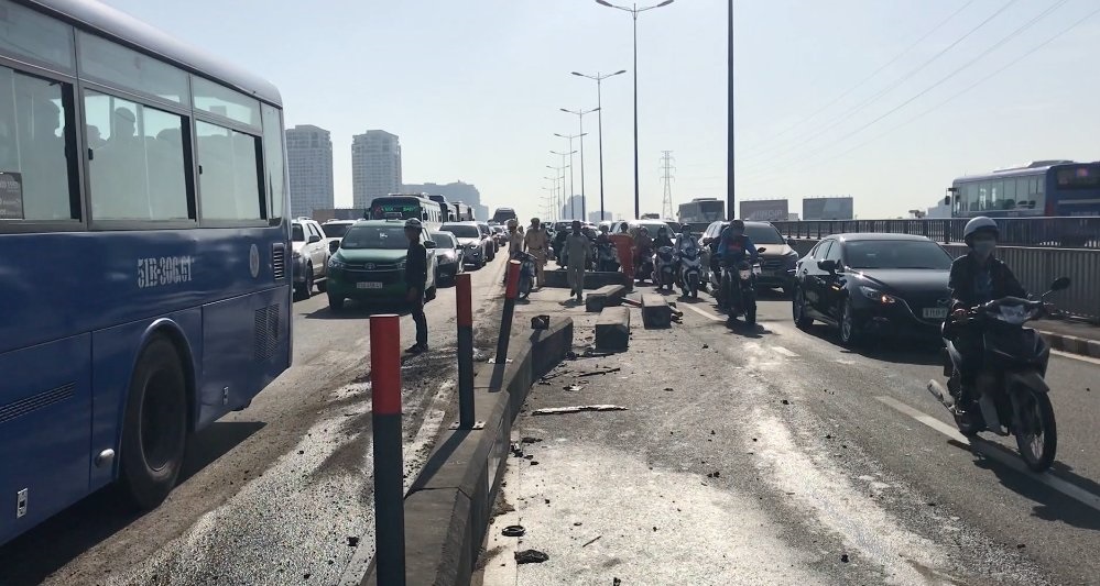 Khi vừa đổ dốc cầu, phương tiện đột ngột mất lái lao sang trái tông trúng dải phân cách bằng bê tông. Chưa dừng lại, xe này tiếp tục lao sang làn đường bên phải, húc vào 1 xe 4 chỗ lưu thông cùng chiều.