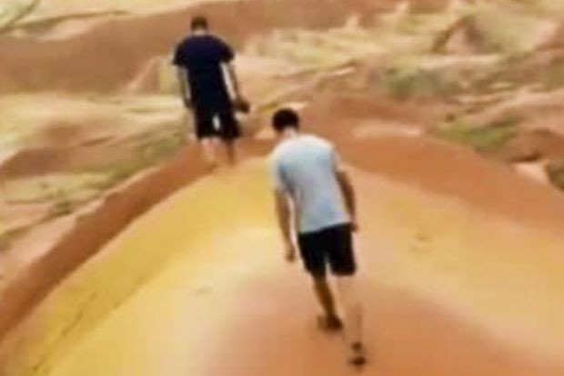 Hai thanh niên bước trên lớp cát địa mạo cổ. (Ảnh chụp màn hình).
