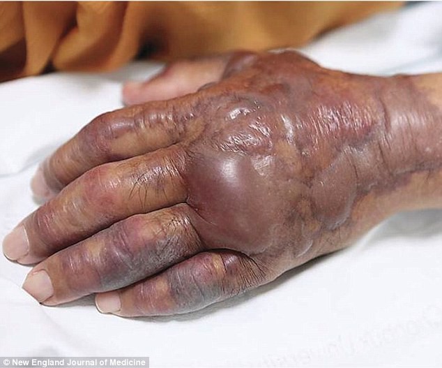 Vết phồng rộp trên lòng bàn tay có kích thước 3,5cm x 4,5cm - xấp xỉ kích thước của một quả bóng golf, trong khi những vết phồng rộp khác trải rộng trên mu bàn tay và cẳng tay. Các bác sĩ chẩn đoán cụ ông bị nhiễm trùng do vi khuẩn Vibrio vulnificus gây ra, trước đó ông đã mắc tiểu đường type 2, huyết áp cao và chạy thận nhân tạo.