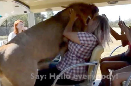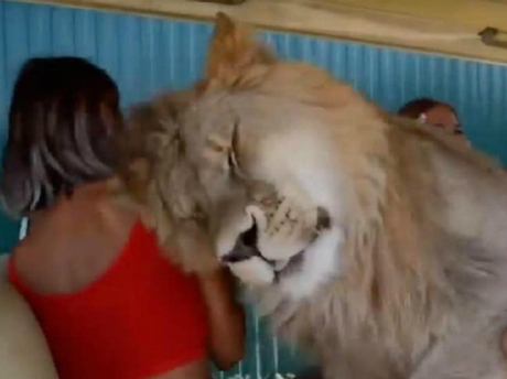 Sư tử là laoij thú rất đáng sợ với mọi người. Nhưng nó được thuần dưỡng mua vui cho khách tham quan, du lịch. Vừa qua một con sư tử 2 tuổi đã lao lên xe tham quan ở công viên hoang dã, dụi đầu, liếm mặt người phụ nữ Nga.