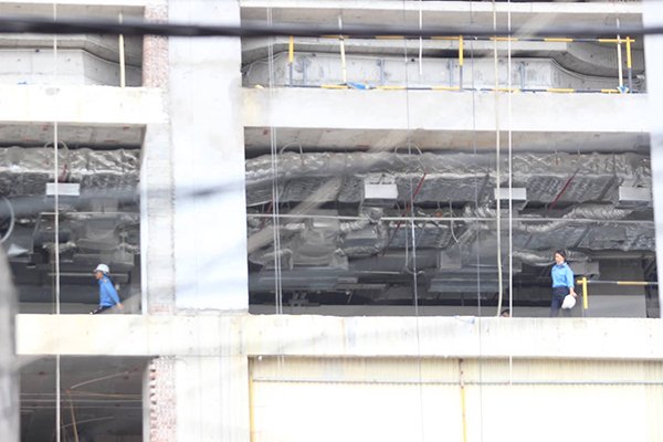 Nhiều công nhân phải rời khỏi tòa nhà đang thi công trên phố Lương Yên. Ảnh: Đoàn Bổng