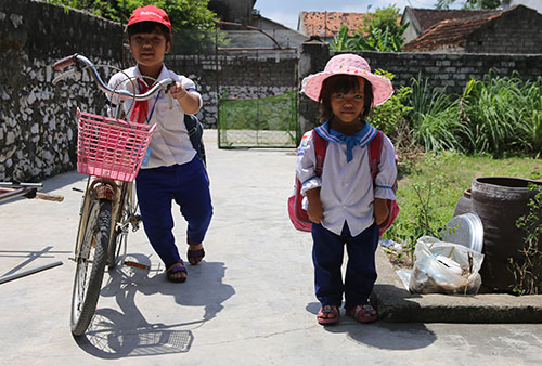 Là con gái thứ ba, em Nguyễn Thị Hòa (8 tuổi) nhưng cao chỉ khoảng 70 cm, trí nhớ kém nên chỉ đi học hòa nhập. Hàng ngày, Hòa được chị gái chở tới trường rồi cuối buổi lại đón về.