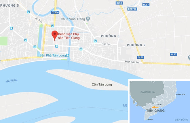 Bệnh viện Phụ sản Tiền Giang (chấm đỏ). Ảnh: Google Maps