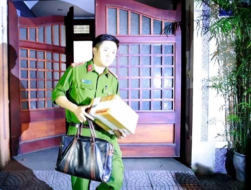 Cảnh sát bê thùng các tông dán niêm phong ra khỏi nhà ông Bằng. Ảnh: Văn Đông