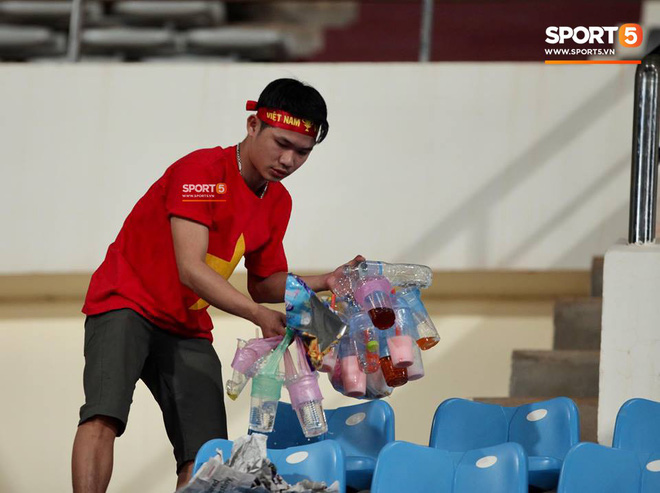 Lượng khán giả kéo đến sân rất đông, do đó không khó hiểu khi rác ở trên khán đài rất nhiều. Tuy nhiên, sau trận, nhiều cổ động viên Việt Nam đã nán lại để thu dọn sạch sẽ cùng ban tổ chức. Ảnh: Hiếu Lương
