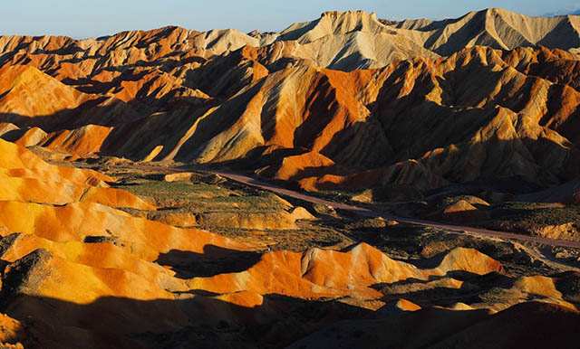 Công viên này nằm ở tỉnh Cam Túc, màu đỏ rực lửa đặc trưng ở đây được hình thành từ những khối đá sa thạch đỏ được bào mòn qua thời gian, khi ánh nắng mặt trời chiếu xuống, chúng sẽ sáng rực lên như cầu vồng.