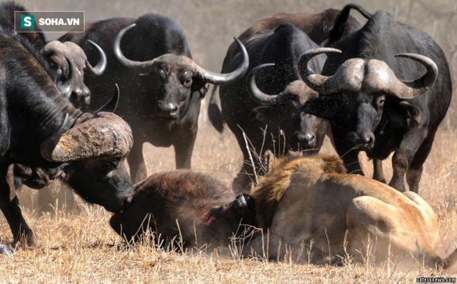 Bốn con trâu rừng khác đã dũng cảm tới cứu đồng loại, một con khơi mào trận chiến sau khi lao thẳng vào bầy sư tử và hất văng 3 kẻ địch. Con sư tử còn lại cố gắng níu giữ con mồi mà chúng phải tốn không ít công sức mới hạ gục được.