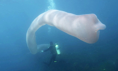 Con giun biển khổng lồ khiến hai thợ lặn vô cùng ngạc nhiên. Nó có chiều dài đến 8m. Thực tế, sinh vật này không phải là một con vật, mà là một tập hợp các cá thể dựa vào nhau để sống giữa biển khơi.