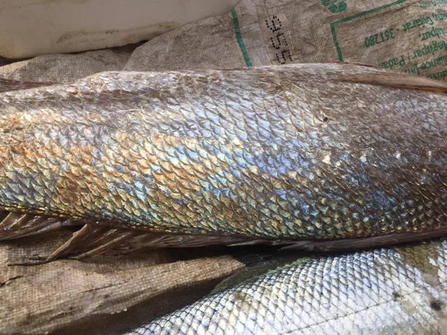 Trên lưng con cá nghi sủ vàng do anh Quý đánh bắt được có nhiều vảy vàng óng ánh.