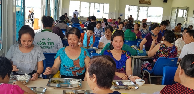 Nhà ăn từ thiện phục vụ 3 bữa ăn mỗi ngày, gồm bữa cháo cho buổi sáng và 2 bữa cơm cho buổi trưa, chiều. Bệnh nhân sau khi ăn xong chỉ cần tự rửa khay thức ăn của mình rồi về giường nghỉ ngơi chờ đến giờ điều trị.