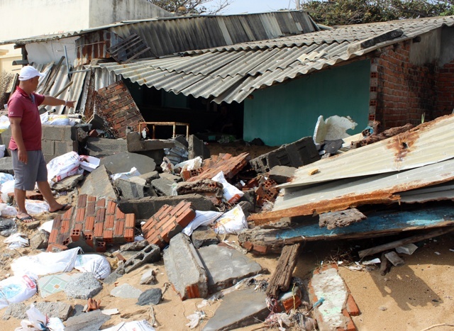 Cũng tại khu dân cư này, trưa 24.11, ông Hồ Quang Nam đã bất chấp hiểm nguy triều cường, quay trở lại nhà tìm nhặt từng tảng đá đè lên mái nhà. “Đêm 23.11, sóng gió nước triều cường quần khắp xóm, nước tràn qua kè đá phủ vào nhà. Cả nhà tôi phải chạy đến nhà người quen ngủ nhờ. Khả năng đêm 24.7, khu vực này sẽ bị triều cường, sóng gió biển tấn công mạnh hơn. Chính quyền đã đến vận động người dân di tản. Giờ còn cái nhà, tôi cố gắng gia cố vì lo sợ chiều nay sóng to đánh sập…”, ông Nam cho hay.