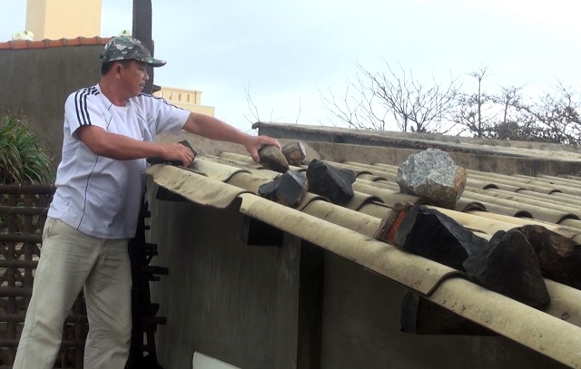 Ông Hồ Quang Nam đang dùng đá chặn giữ mái nhà.