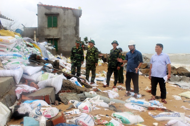 Bao cát chắn kè Bạch Đằng (Tuy Hòa) bị triều cường đánh tan tác.