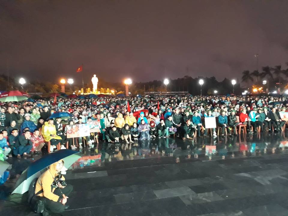 Hòa chung không khí đó, tại Hà Tĩnh, Nghệ An - quê hương của rất nhiều cầu thủ đang thi đấu trên sân, mưa càng ngày càng nặng hạt, nhưng dường như không thể ngăn cản tình yêu dành cho đội tuyển Việt Nam của người hâm mộ. Họ đã cùng đội mưa, theo dõi trận đấu trên những màn hình chiếu cỡ lớn cùng hô vang "Việt Nam vô địch! Việt Nam chiến thắng".