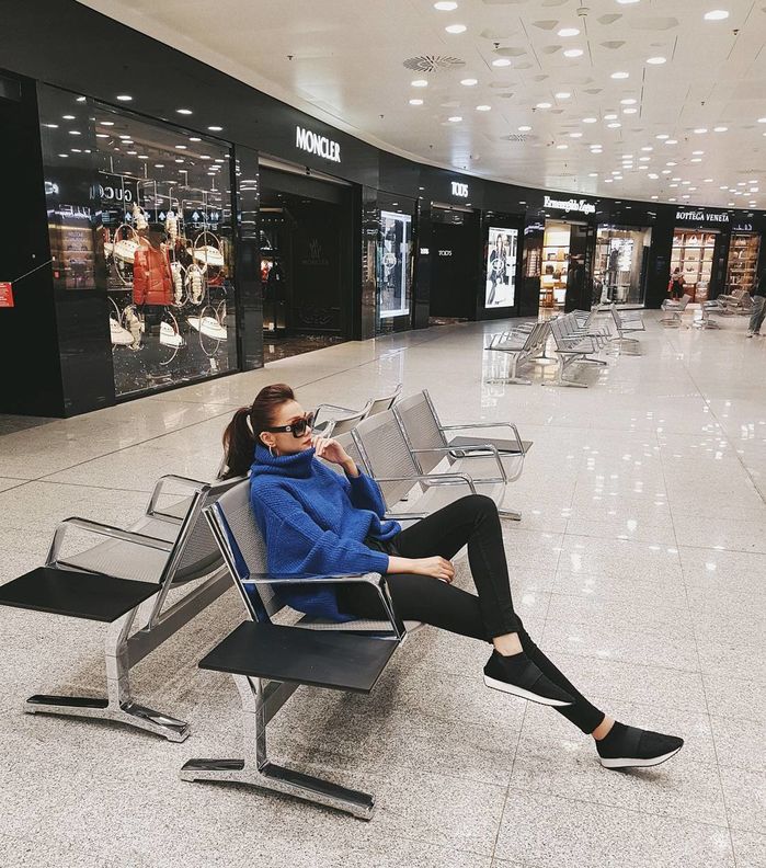 Áo len cao cổ oversized được siêu mẫu mix cùng quần skinny và giày sneaker mang đến dáng vẻ khỏe khoắn, năng động.