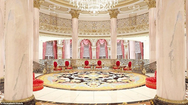 Sảnh chính lớn của khách sạn với nội thất được lấy cảm hứng từ các cung điện châu Âu trong quá khứ.