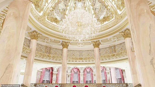 Những cột đá cẩm thạch sang trọng và đèn chùm với hơn 40.000 viên pha lê Swarovski.