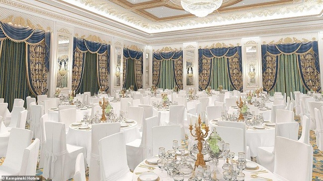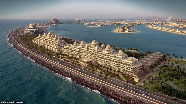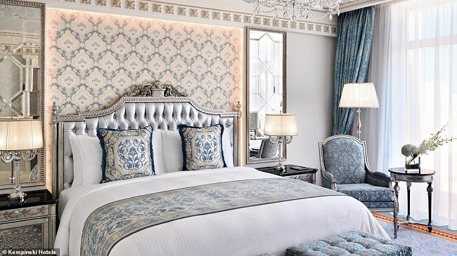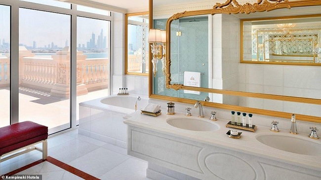 Khách sạn ở Dubai được biết đến là sang trọng và hào nhoáng bậc nhất trên thế giới. Vì vậy, không có gì ngạc nhiên khi The Emerald Palace Kempinski với chi phí xây dựng 700 triệu USD sở hữu trần nhà dát vàng 24 karat, hơn 6.400 đèn chùm pha lê. Và tất nhiên, các phòng của khách sạn rất đắt đỏ với mức giá cao nhất hơn 160 triệu VND.