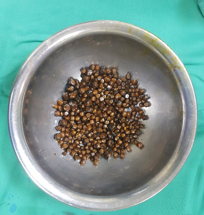 Gần 400 viên sỏi được gắp ra khỏi mật bệnh nhân. (Ảnh: **********)