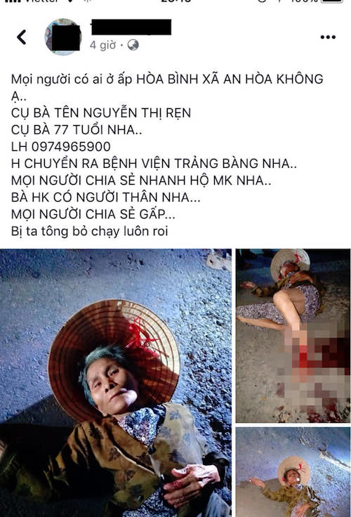 Vụ tai nạn xảy ra vào tối ngày 27/12 tại xã An Hoà, Tây Ninh. Tài xế lái xe tông gãy chân cụ bà 77 tuổi rồi bỏ trốn. Hoàn cảnh của cụ bà rất đáng thương, 77 tuổi vẫn đi nhặt ve chai.