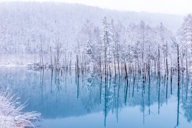 Hồ Blue, Hokkaido, Nhật Bản: Một trong những địa điểm hấp dẫn nhất trên đảo Hokkaido là hồ Blue. Nơi đây biến đổi hoàn toàn vào mùa đông, khi mặt hồ đóng băng và cây bị băng tuyết bao phủ.