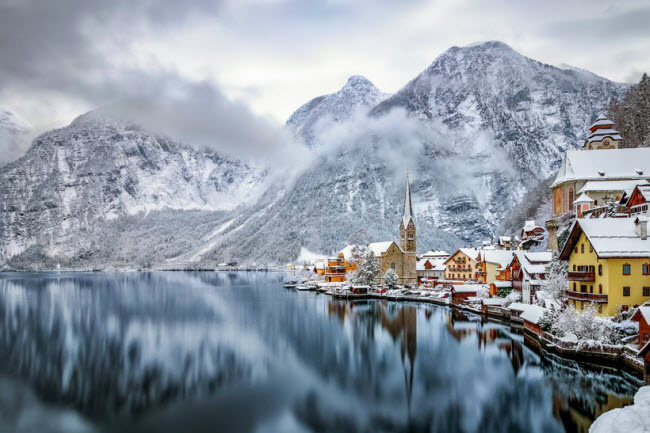 Hallstatt, Áo: Phong cảnh hồ và các ngôi nhà từ thế kỷ thứ 12 khiến thị trấn Hallstatt trông như một bức tranh vẽ. Vào mùa đông, du khách có cơ hội chiêm ngưỡng tuyết phủ kín các ngọn núi xung quanh.