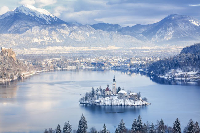 Hồ Bled, Slovenia: Hồ Bled có một hòn đảo nhỏ ở giữa và nơi đây là một trong những điểm du lịch thu hút đông du khách nhất ở Slovenia. Phong cảnh ở đây càng trở nên ấn tượng hơn khi núi Julian Alps xung quanh được bao phủ bởi tuyết.