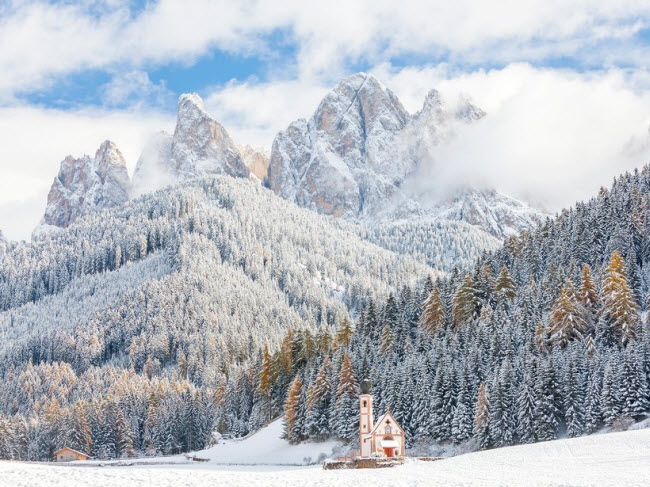 Dolomites, Nam Tyrol, Italia: Sườn của núi Dolomites được phủ tuyết trắng vào mùa đông, khiến nơi đây trông giống như thiên đường mùa đông trong truyện cổ tích.