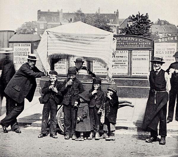 Trẻ con tụ tập bên xe bán kem tại con phố Stockwell. Là món ăn ưa thích của nhiều người, đặc biệt là trẻ em, các xe đẩy bán kem luôn thu hút lượng khách lớn là các em nhỏ.