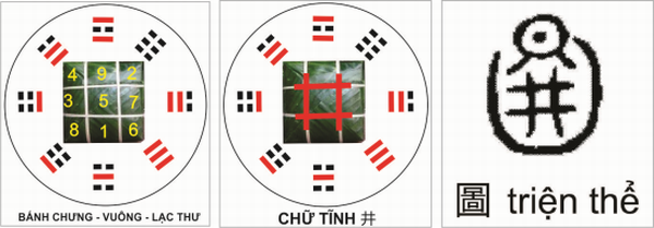Khi gói, để bánh khỏi bị bể khi nấu, người ta có thể buộc nhiều dây, nhưng khi đem cúng, người xưa chỉ để có 4 dây mà thôi. Bốn dây này làm thành cửu cung như hình minh họa; đồng thời còn vẽ ra trên ấy một con chữ có từ ngàn xưa mà hầu như ít ai quan tâm, chỉ có những người làm ra nó mới biết sự liên quan giữa cái bánh và con chữ chỉ nguồn gốc dịch học, mà cũng là nguồn gốc chữ vuông của người Việt mà thôi, đó là chữ Tỉnh井, nghĩa là cái giếng. Chữ Tỉnh 井tượng trưng cho Lạc thư – Hậu thiên Bát quái, tức Thái cực, vì người Việt là người Nam thuộc Thái cực – Dương. Chính vì vậy mà tiền nhân nước Việt đã viết truyền thuyết Việt Tỉnh Cương, thường dịch là Giếng Việt. Lạc Thư được sinh ra từ Hà Đồ, vì vậy ta thấy trong chữ Đồ圖 triện thể có chữ Tỉnh井.