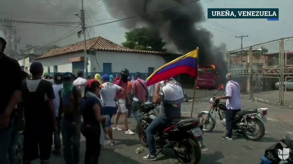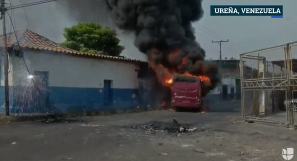 Xe bus chở quân Maduro bị đốt cháy, xuất hiện rừng người biểu tình. Những người biểu tình đeo mặt nạ đã cướp một chiếc xe buýt của chính phủ và đốt cháy nó khi cố gắng phá vỡ hàng rào lính.