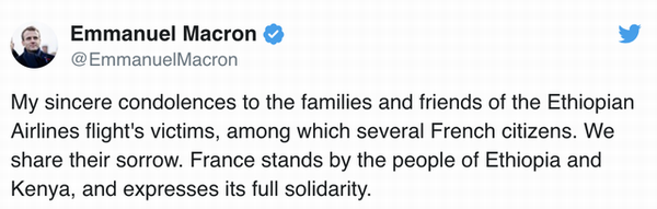 Dòng tweet của Tổng thống Pháp có nội dụng: "Tôi gửi lời chia buồn sâu sắc tới gia đình và bạn bè của các nạn nhân trên chuyến bay của hãng hàng không Ethiopian Airlines, mà trong đó có 7 công dân Pháp. Chúng tôi chia sẻ nỗi buồn cùng họ. Nước Pháp sẽ ở bên người dân Ethiopia và Kenya, thể hiện tình đoàn kết."